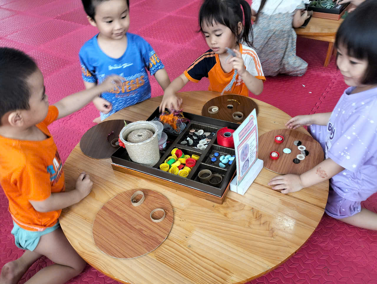 Các bạn nhỏ sôi nổi thảo luận “chúng ta sẽ làm gì” và tích cực, hăng hái cùng nhau thực hiện nhiệm vụ chung. Và cứ như vậy, các góc của lớp trở nên sôi động với những hoạt động thú vị.