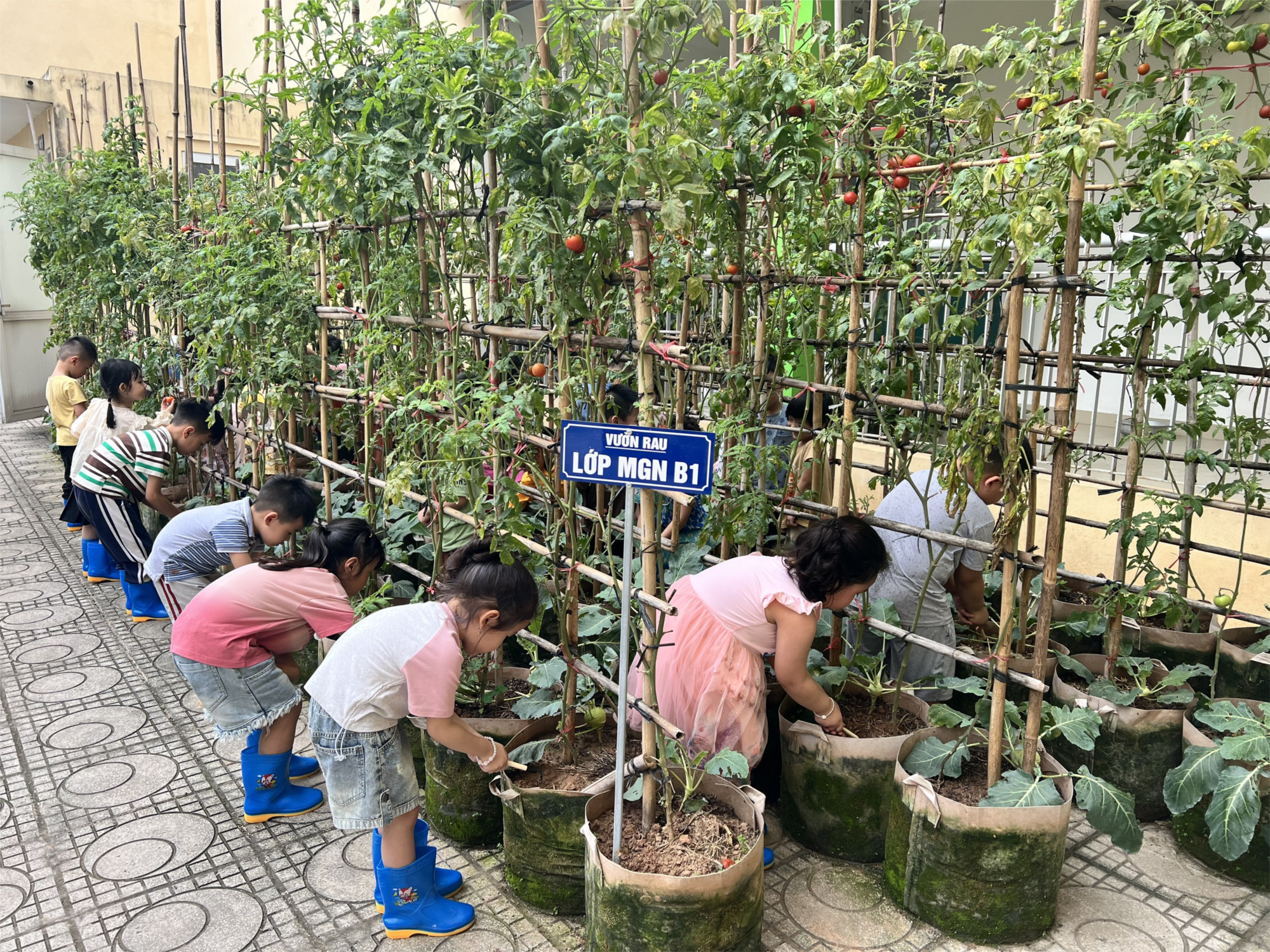 Trong buổi lao động, giáo viên cho trẻ tự chăm sóc và thu hoạch vườn rau sạch của lớp. Trẻ được nhổ cỏ cho vườn cà chua, một số trẻ đi thu hoạch những quả cà chua đã chín. Trẻ còn được bắt sâu chăm sóc cho những luống su hào của lớp. Qua buổi lao động trẻ có kĩ năng nhổ cỏ, bắt sâu cho cây. Trẻ rất hứng thú khi được tự mình chăm sóc và thu hoạch vườn rau sạch của lớp mình