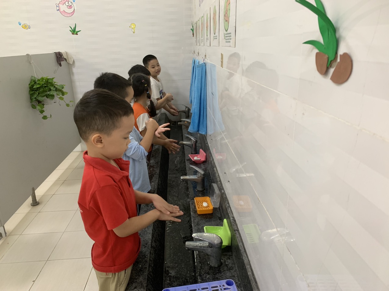 Trưa thứ sáu ngày 19 tháng 4 năm 2024: Lớp MGL A1 tổ chức cho trẻ rửa tay rưả mặt trước giờ ăn. Lần lượt từng bàn đứng lên rửa tay với xà phòng đúng theo 6 bước rửa tay chuẩn. Trẻ rửa thuần tay thục các thao tác dưới vòi nước sạch. Sau đó trẻ ra lấy khăn rửa mặt. Trẻ rửa từng bước theo hướng dẫn của giáo viên. Hoạt động vệ sinh rửa tay, rửa mặt là hoạt động rất cần thiết trước giờ ăn giúp trẻ tránh được vi khuẩn đi theo tay vào miệng qua thức ăn bảo vệ sức khỏe trẻ.