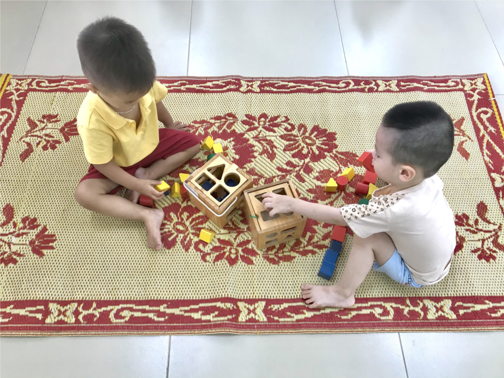 Chiều ngày 30 tháng 6 lớp NTD2 tổ chức cho trẻ chơi trò chơi thả hình. KHi chơi với đồ chơi tre xác định được các dạng hình khối để thả vào đúng khuôn hình tương ứng
