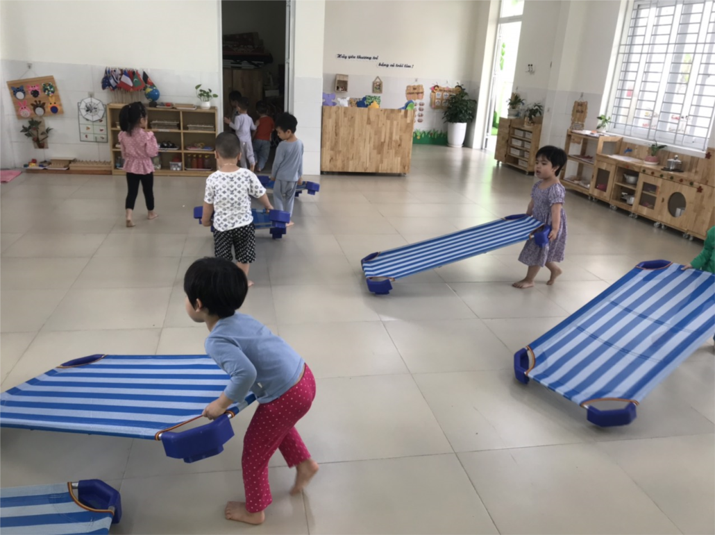 Chuẩn bị giờ ngủ các con đã biết giúp đỡ cô kê giường, với tác phong nhanh nhẹn và hứng thú chỉ trong một thời gian ngắn đã hoàn thành nhiệm vụ giường được sắp xếp ngay ngắn theo thứ tự.