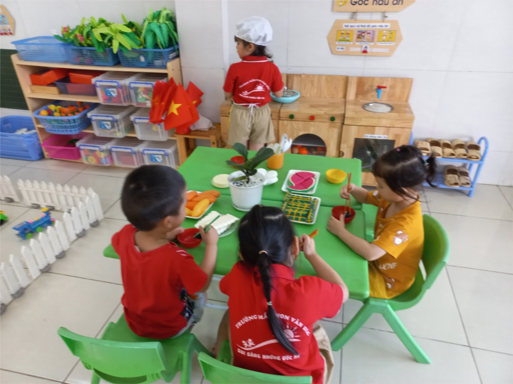 Trẻ rất vui vẻ và tham gia rất hào hứng khi tham gia hoạt động góc. Ở đây trẻ được đóng làm người lớn tập nấu những món ăn mà mình thích. từ đó trẻ biết thêm các món ăn, cách chế biến đơn giản. Tập các kĩ năng sơ chế, nấu, rửa, tậ gắp đồ ăn, cách sắp xếp và cất dọn phù hợp. Qua đó rèn các kĩ năng cho trẻ rất tốt.