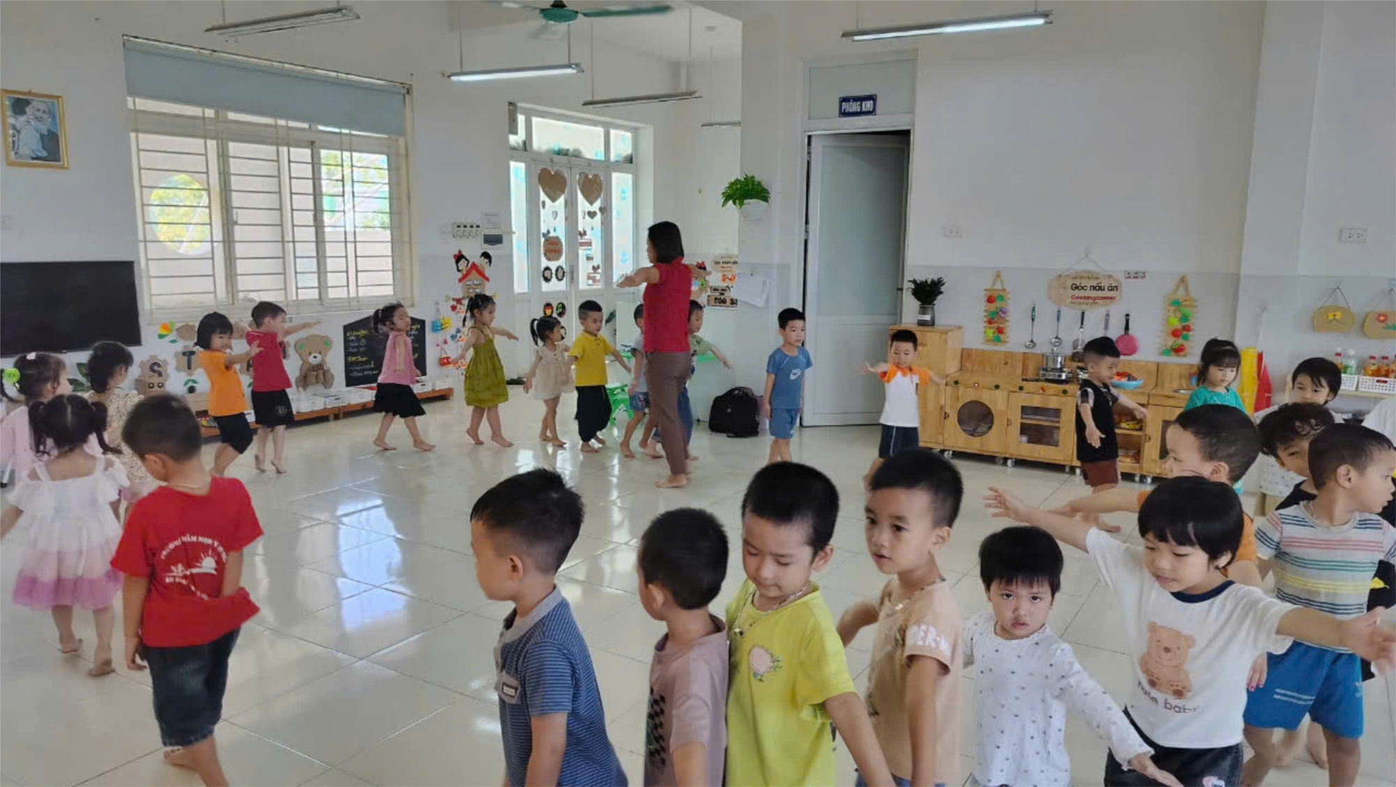 Trước khi thực hiện vận động cô giáo cho trẻ khởi động, tập bài tập phát triển chung. Qua sự hướng dẫn của cô giáo trẻ có kĩ năng tập vận động " bật xa 35cm- 40cm". Trong giờ học trẻ còn được tham gia vào trò chơi chuyền bóng. Trẻ hứng thú tham gia vào bài tập và chơi trò chơi.