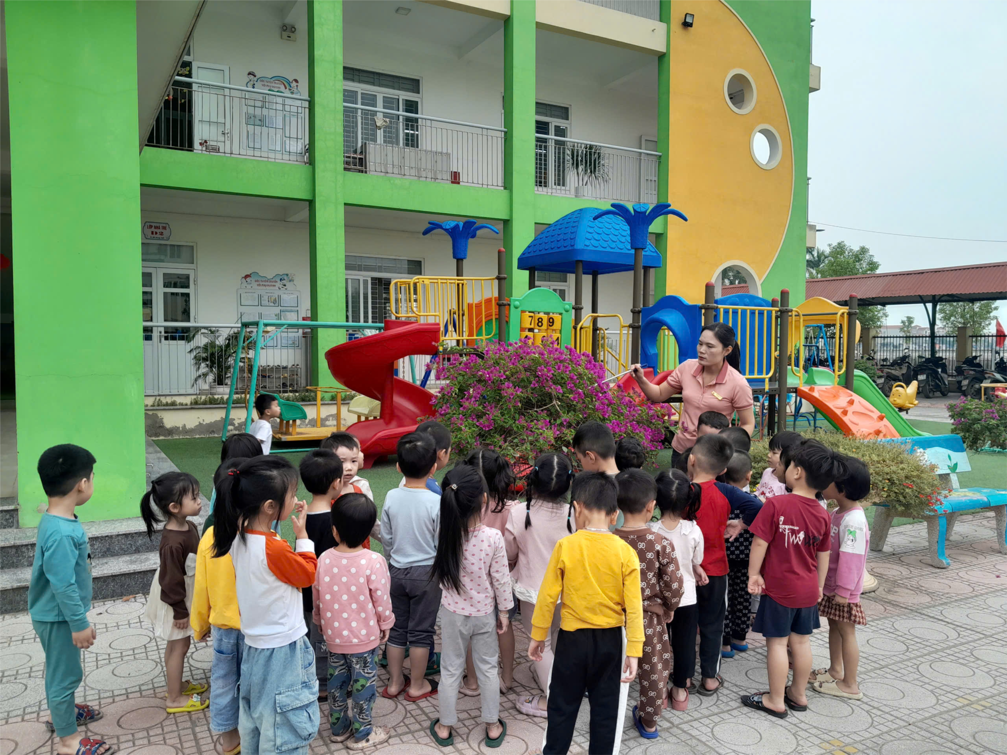 Trong buổi hoạt động ngoài trời trẻ được tìm hiểu về tên gọi, đặc điểm, ích lợi và cách chăm sóc cây hoa giấy. Cô giáo còn cho trẻ tham gia vào trò chơi " mèo đuổi chuột" vô cùng thú vị. Ngoài ra, trẻ còn được chơi với những đồ chơi ngoài trời mà mình yêu thích.