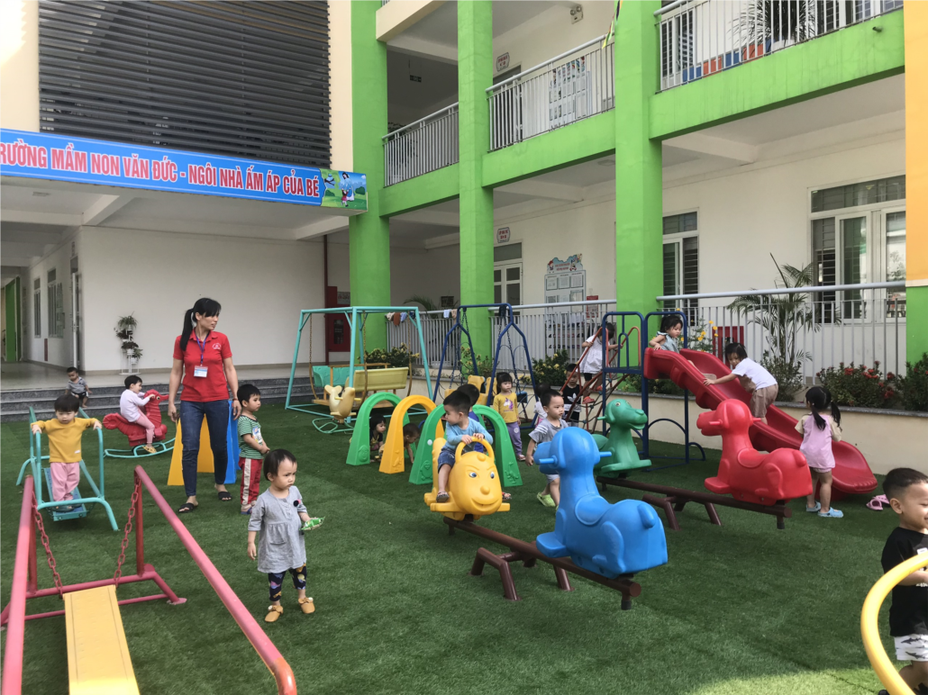 Thời tiết mát mẻ, các con thích thú vô cùng khi được cùng nhau hoạt động ngoài trời với các trò chơi tự do trong khu vực vui chơi của trường.