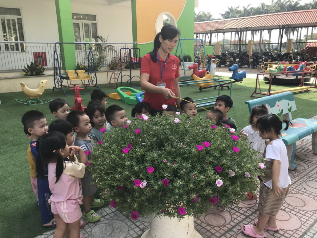 Các bé cùng tham gia hoạt động quan sát cây hoa mười giờ trong sân trường. Cô cung cấp kiến thức về tên gọi, màu sắc, đặc điểm của hoa và cho các bé tập nói, nhắc lại.