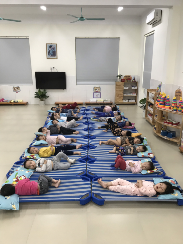 Các con được chuẩn bị giờ ngủ cùng cô, được cô hướng dẫn tư thế nằm thoải mái, an toàn để có giấc ngủ ngon, không nói chuyện hay gây ra tiếng động lớn ảnh hưởng đến các bạn bên cạnh.
