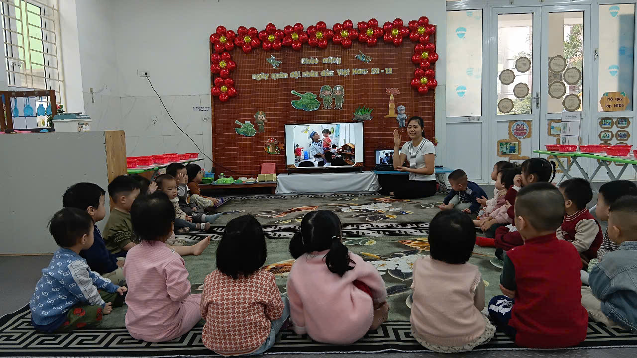 Thứ 3, ngày 16 tháng 12 năm 2025 GVCN lớp NTD3 tổ chức hoạt động Nhận biết tập nói: Chú bộ đội cho các con học sinh. Như chúng ta đã biết ngôn ngữ luôn có vai trò to lớn trong sự hình thành và phát triển nhân cách của trẻ. “Ngôn ngữ là phương tiện để phát triển tư duy”, là công cụ để giúp phát triển tư duy và là phương tiện để giáo dục tình cảm, thẩm mỹ cho trẻ. Trong giáo dục trẻ mầm non hiện nay, chúng ta càng thấy rõ vai trò của ngôn ngữ đối với việc giúp trẻ trở thành những con người phát triển về mọi mặt: đức, trí, thể, mỹ và hình thành những cơ sở ban đầu của nhân cách con người. Để phát triển ngôn ngữ cho trẻ, tại trường mầm non cô giáo luôn dạy các con phát âm chuẩn, chính xác đúng Tiếng Việt. Thông qua hoạt động học tập như: Làm quen với văn học, nhận biết tập nói… và dạy các con ở mọi lúc mọi nơi qua các hoạt động hàng ngày, từ đó trẻ khám phá hiểu biết về mọi sự vật hiện tượng, về thế giới xung quanh trẻ, phát triển tư duy. Muốn cho ngôn ngữ của trẻ phát triển thuận lợi, một trong những điều kiện quan trọng là trẻ được tích luỹ nhiều vốn từ và trên cơ sở hiểu biết đầy đủ ý nghĩa của những từ đó, trẻ biết cách sử dụng “số vốn” đó một cách thành thạo. Để phát triển ngôn ngữ cho trẻ cần phân chia theo đúng độ tuổi quy định, đồ dùng cho trẻ sử dụng luôn phong phú về hình ảnh, màu sắc hấp dẫn. Với chủ đề ngày thành lập Quân đội nhân dân Việt Nam 22/12 GVCN lớp NTD3 đã lựa chọn hoạt động NBTN: Chú bộ đội để dạy các con biết tên gọi, trang phục và nhiệm vụ cao cả của các chú bộ đội. Từ đó giáo dục các con biết ơn, kính trọng và yêu thương các chú bộ đôi_ Người có công lao to lớn với đất nước Việt Nam chúng ta.
