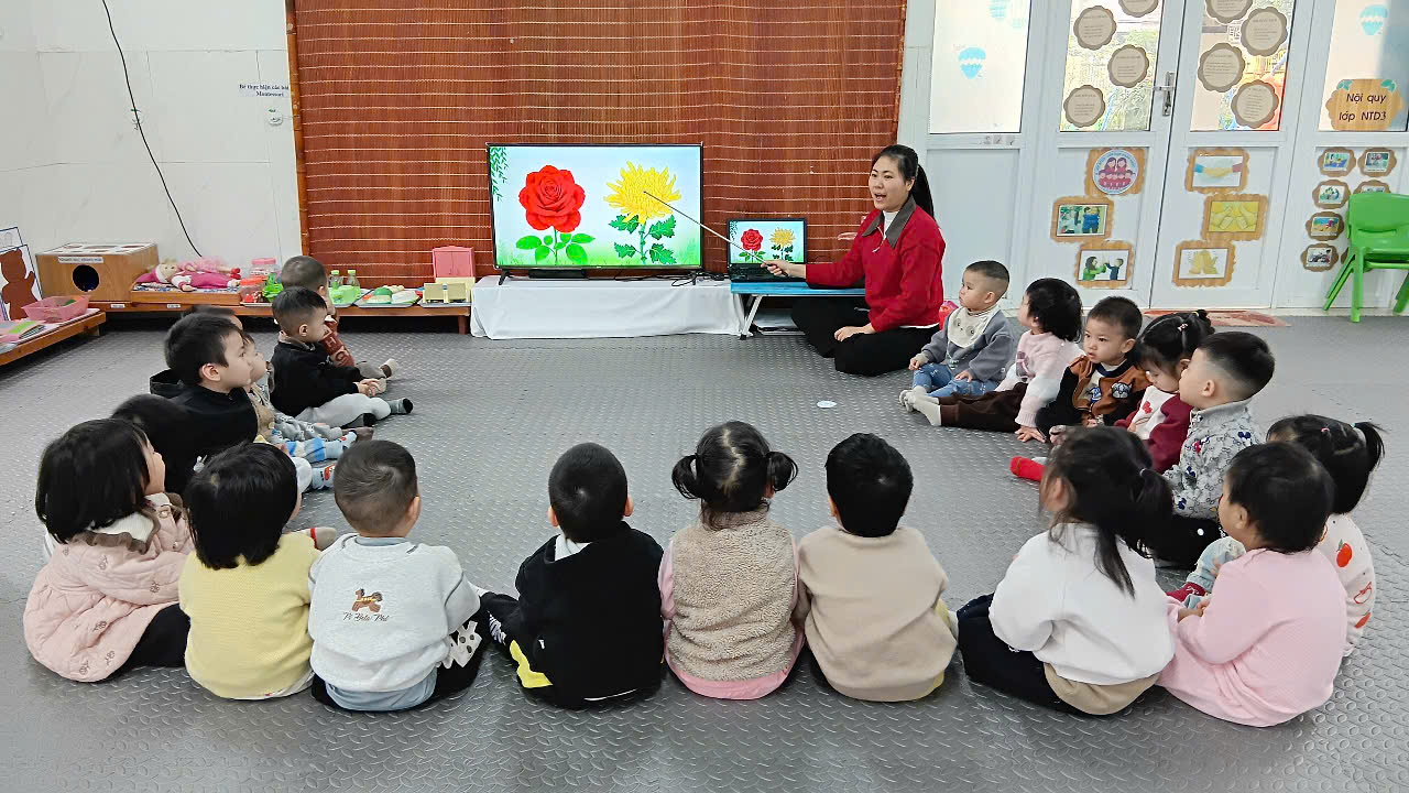 Hôm nay các bé lớp Nhà trẻ D3 tham gia hoạt động nhận biết tập nói với chủ đề “Hoa hồng, hoa cúc”. Cô giáo giới thiệu cho các con quan sát bông hoa hồng đỏ tươi với nhiều cánh mềm mại. Các bé được sờ nhẹ vào cánh hoa và ngửi hương thơm dịu dàng. Cô hướng dẫn trẻ phát âm rõ ràng từ “hoa hồng” theo cô. Nhiều bé mạnh dạn nhắc lại to và tròn tiếng. Tiếp theo, cô cho các con quan sát hoa cúc vàng rực rỡ. Bé nhận biết đặc điểm cánh hoa nhỏ, nhiều và xếp thành vòng tròn. Các con tập nói từ “hoa cúc” một cách hào hứng. Cô đặt câu hỏi đơn giản để trẻ trả lời như: “Đây là hoa gì?”. Các bé giơ tay phát biểu và trả lời theo khả năng của mình. Hoạt động giúp trẻ mở rộng vốn từ về thế giới xung quanh. Trẻ được rèn kỹ năng phát âm và nói rõ lời hơn. Không khí lớp học diễn ra nhẹ nhàng, vui vẻ và sinh động. Cô luôn động viên, khích lệ để các con tự tin giao tiếp. Qua hoạt động, các bé lớp Nhà trẻ D3 thêm yêu thích các loài hoa và mạnh dạn hơn trong tập nói.
