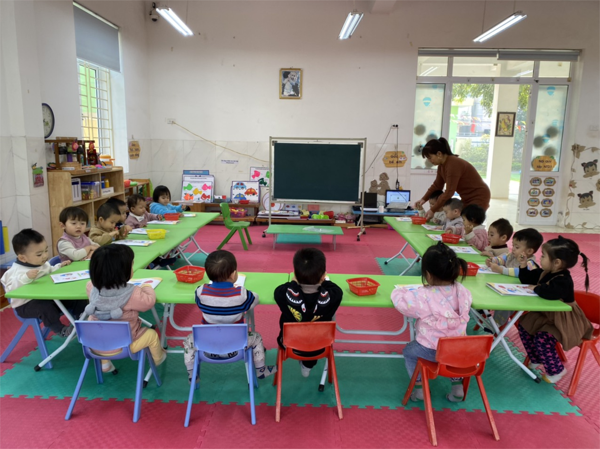 Thứ 2 ngày 25 tháng 12 năm 2023. Lớp NTD3. Tổ chức hoạt động chiều: Bé làm quen với toán: Ôn: Màu xanh, đỏ. Thông qua giờ hoạt động chiều giúp trẻ phát triển ngôn ngữ to rõ ràng mạch lạc, trả lời đủ câu. Trẻ ôn lại 2 màu xanh, đỏ. Rèn cho trẻ có kỹ năng nhận biết phân biệt 2 màu xanh và màu đỏ thông qua môn bé làm quen với toán. Trẻ có kỹ năng cầm bút đúng cách và chọn đúng màu để tô. Trong giờ học trẻ hứng thú tham gia. Khi học trẻ phải ngồi ngay ngắn và không được vẽ ra bàn và lau tay vào quần áo. Trẻ tập chung vào tô màu.