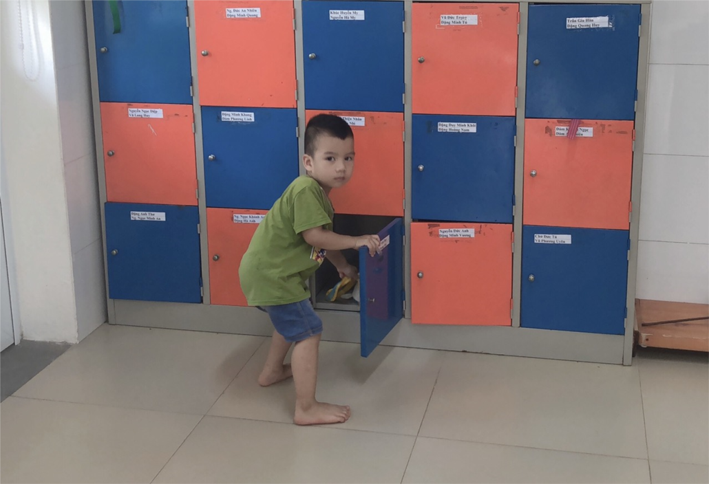 Sáng thứ năm ngày 30 tháng 6 rèn cho trẻ kĩ năng tự phục vụ: cất lấy ba lô tại lớp NTD2. Qua bài tập trẻ có thể tự phục vụ bản thân, tự cất lấy đồ khi cần mà không cần nhờ sự giúp đỡ của cô.