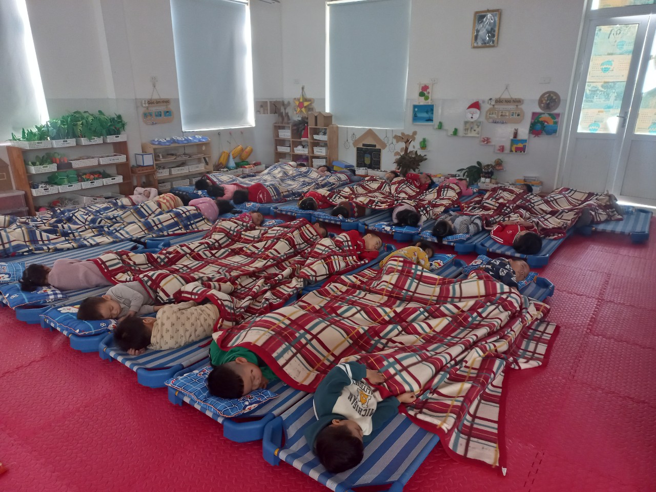 Việc chăm sóc nuôi dưỡng rất quan trọng đối với các con. Đến lớp ngoài được học các bài học từ cô giáo, các con còn được các cô chăm sóc từ bữa ăn đến giấc ngủ. Sau khi được ăn bữa trưa, các con đã cùng nhau bước vào giờ ngủ. Dưới sự quan tâm,chăm sóc của các cô, được nằm trong những chiếc chăn ấm, các con đã có một giấc ngủ ngon lành để sẵn sàng cho một buổi chiều đầy năng lượng.