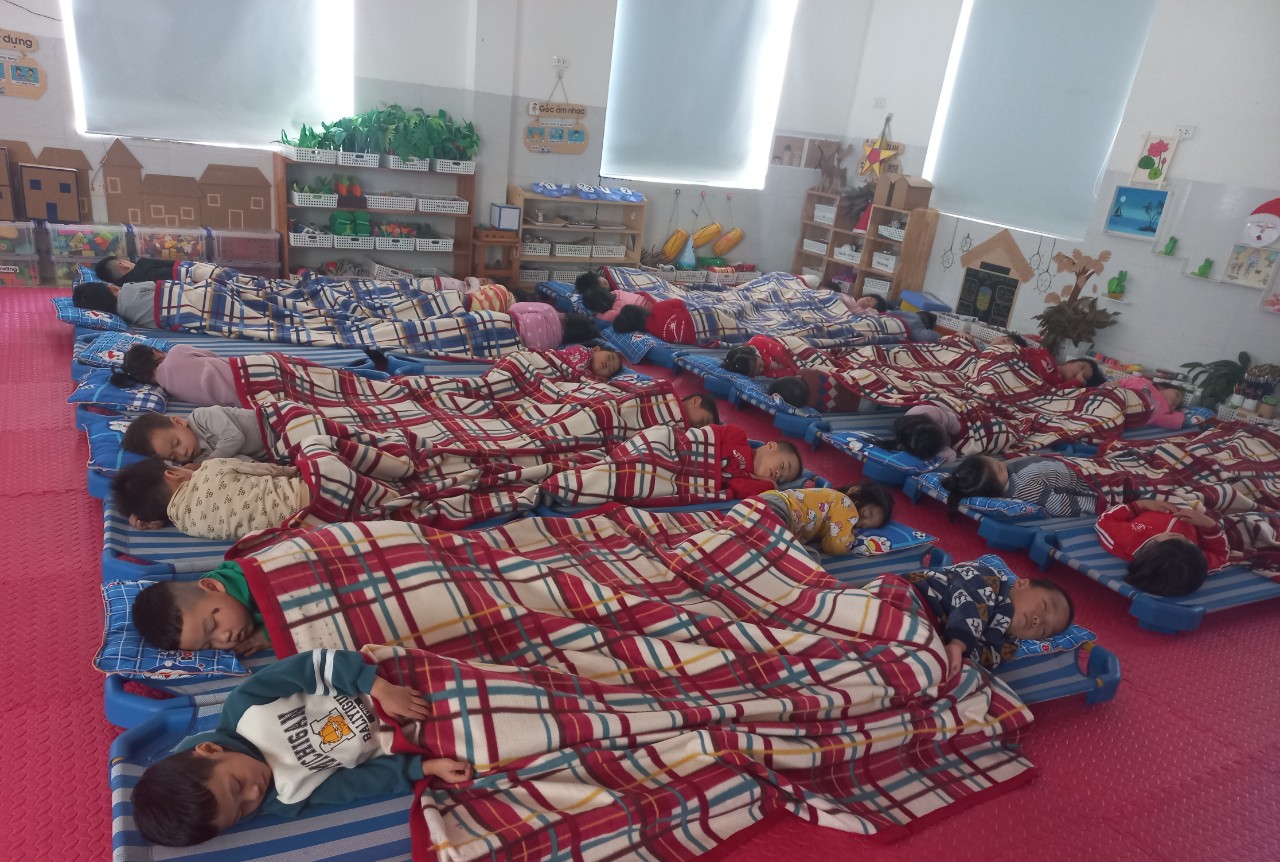 Để các con phát triển toàn diện, ngoài việc học, việc chơi lớp. Các con đã được ngủ trưa tại trường, với những đồ dùng mà nhà trường đã trang bị đầy đủ cho các con: chăn, giường, gối,...Các bé đã có một giấc ngủ say tại lớp học của mình.