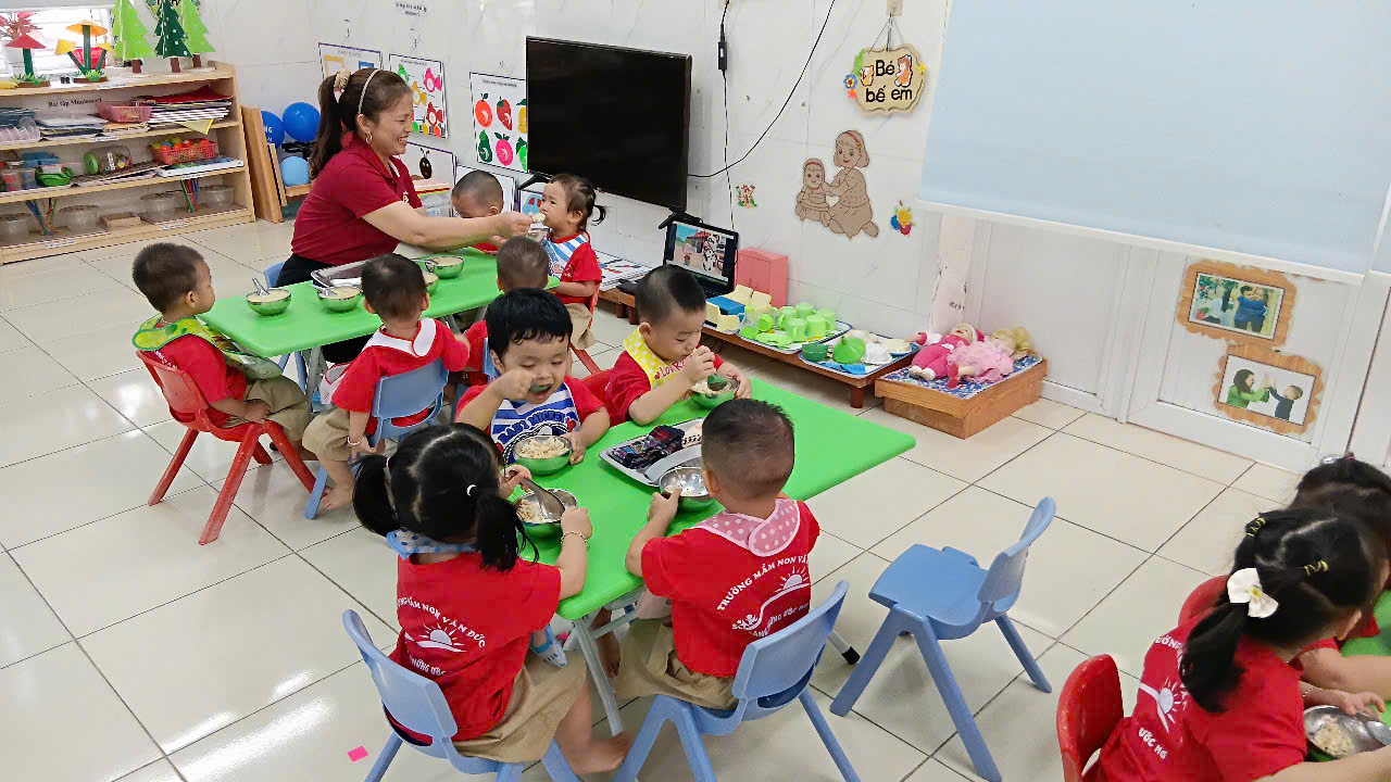 Trưa thứ 2 ngày 8 tháng 9 năm 2025, GVCN lớp NTD3 tổ chức giờ ăn cho các con học sinh.