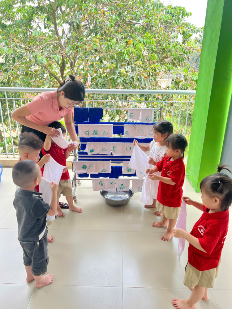 Thứ tư, ngày 16 tháng 10 lớp MGB-C2 tổ chức hoạt động vệ sinh cá nhân và chuẩn bị ăn bữa chính. Các bạn giúp GV kê bàn, sau đó các bạn lau bàn. GV yêu cầu từng tổ đi bê ghế, rửa tay, rửa mặt vệ sinh cá nhân sạch sẽ trước khi ăn. GV động viên, bao quát, khuyến khích trẻ ăn hết xuất của mình.