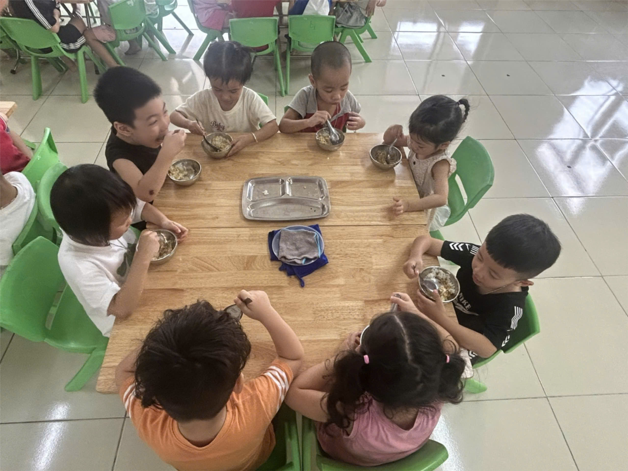 Trước khi vào giờ ăn cô giáo cho trẻ kê bàn, lau bàn ăn. Trẻ được làm vệ sinh cá nhân sạch sẽ trước khi ăn. Trong giờ ăn cô giáo đã giới thiệu các món ăn, giáo dục dinh dưỡng cho trẻ, động viên trẻ ăn hết suất của mình. Trẻ có kĩ năng ngồi ăn đúng tư thế, xúc ăn gọn gàng, không rơi vãi.