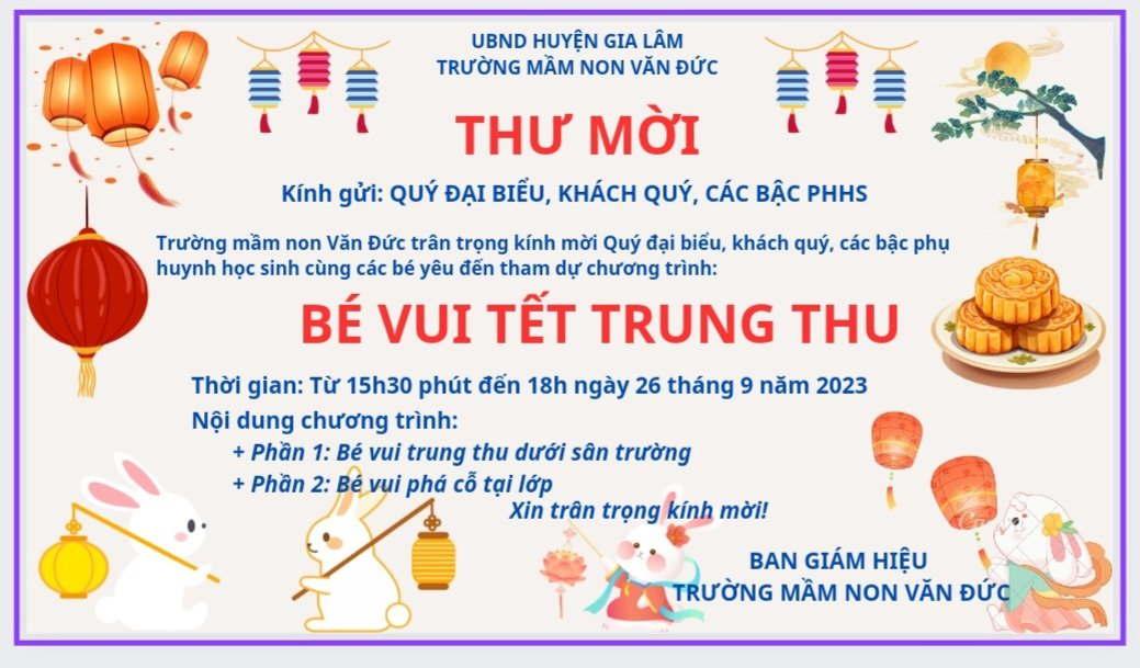 Trường Mn Văn Đức xin trân trọng kính mời quý đại biểu, khách quý, phụ huynh học sinh cùng toàn thể PHHS và các con học sinh tới tham dự chương trình: "Bé vui tết trung thu 2023".