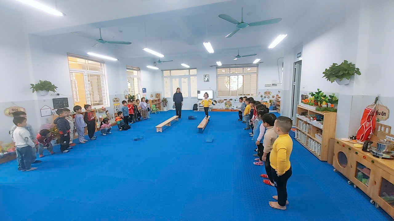 Sáng ngày 09/12/2024 lớp MGN B2 tổ chức hoạt động giáo dục thể chất: Đi trên ghế thể dục đầu đội túi cát.