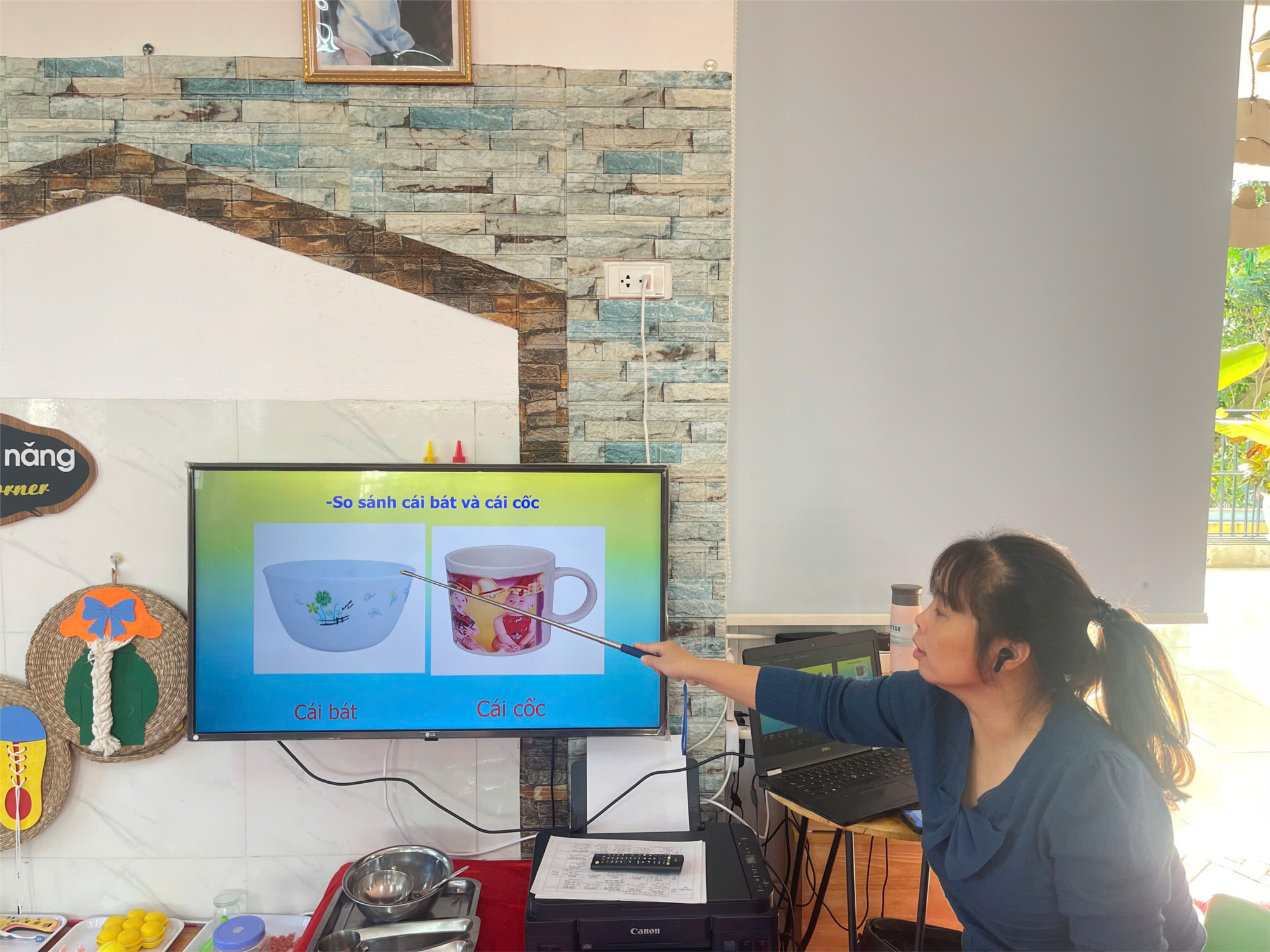 1.Ổn định tổ chức ( 1-3p) -Cô giới thiệu khách - Cô và trẻ hát vận động bài hát “ Nhà của tôi”. - Cô đàm thoại và dẫn dắt vào bài. 2. Phương pháp và hình thức tổ chức (20- 25p) *HĐ1: Đồ dùng để ăn * Quan sát cái bát: - Cô đọc câu đố: “Miệng tròn lòng trắng phau phau Đựng cơm, đựng thịt, đựng rau hàng ngày” Là cái gì? - Cho trẻsờ cái bát - Cho trẻ nêu nhận xét? - Bát này dùng để làm gì? - Miệng bát có dạng hình gì? - Bát được làm bằng chất liệu gì? - Các con sờ cái bát thấy nó thế nào? - Đây là bát to hay bát nhỏ? - Ngoài bát để đựng cơm còn có bát to, tô để đựng canh và bát nhỏ xíu để đựng nước chấm. => Bát được làm từ nhiều chất liệu khác nhau như bằng phíp, nhựa, inox, thủy tinh, bằng sứ..Bát sứ và thủy tinh các con nhớ khi sử dụng phải cẩn thận không làm rơi, rơi sẽ vỡ và làm đứt tay, khi dùng xong các con nhớ rửa thật sạch sau đó cất cẩn thận. - Xem quy trình làm bát - Ngoài bát để ăn, còn đồ dùng nào để ăn? - Quan sát: đũa, đĩa, thìa ... * HĐ2: Đồ dùng để uống -Cô đọc câu đố: “Miệng tròn lòng rộng có quai Bé cầm uống nước hàng ngày trên tay” Là cái gì? - Cái cốc này dùng để làm gì? - Miệng cốc có dạng hình gì? - Cốc được làm bằng chất liệu gì? - Các con sờ cái cốc thấy nó thế nào? - Thân cốc có thêm cái gì đây? - Ngoài cốc để uống nước còn đồ dùng gì để uống nước? => Cốc, chén, ca, ly, ấm, phích ... là những đồ dùng để uống hàng ngày. Khi sử dụng các con giữ gìn cẩn thận không làm rơi nhé. Nhất là phích nước rất nguy hiểm các con không đựơc đùa nghịch, muốn uống nước ấm phải nhờ bố mẹ lấy cho nhé! *HĐ3: So sánh - Cái bát và cái cốc có đặc điểm gì giống nhau và đặc điểm khác nhau? + Giống nhau: Đều là đồ dùng trong gia đình, giống về chất liệu + Khác nhau: Bát là đồ dùng để ăn Cốc là đồ dùng để uống *HĐ4: Trò chơi *Trò chơi chung sức - Cách chơi: Chia trẻ thành 2 đội, nhiệm vụđội 1 chọn bát, đội 2 chọn cốc vận chuyển về nhà giúp bạn búp bê. - Luật chơi: Chọn đúng đồ dùng với được tính điểm - Cô nhận xét *Trò chơi bé khéo tay - Cách chơi: Chia trẻ thành 3 nhóm, trẻ trang trí đồ dùng để ăn uống . - Cho trẻ về nhóm chơi 3. Kết thúc (1- 3p) - Cô nhận xét kết thúc giờ học |