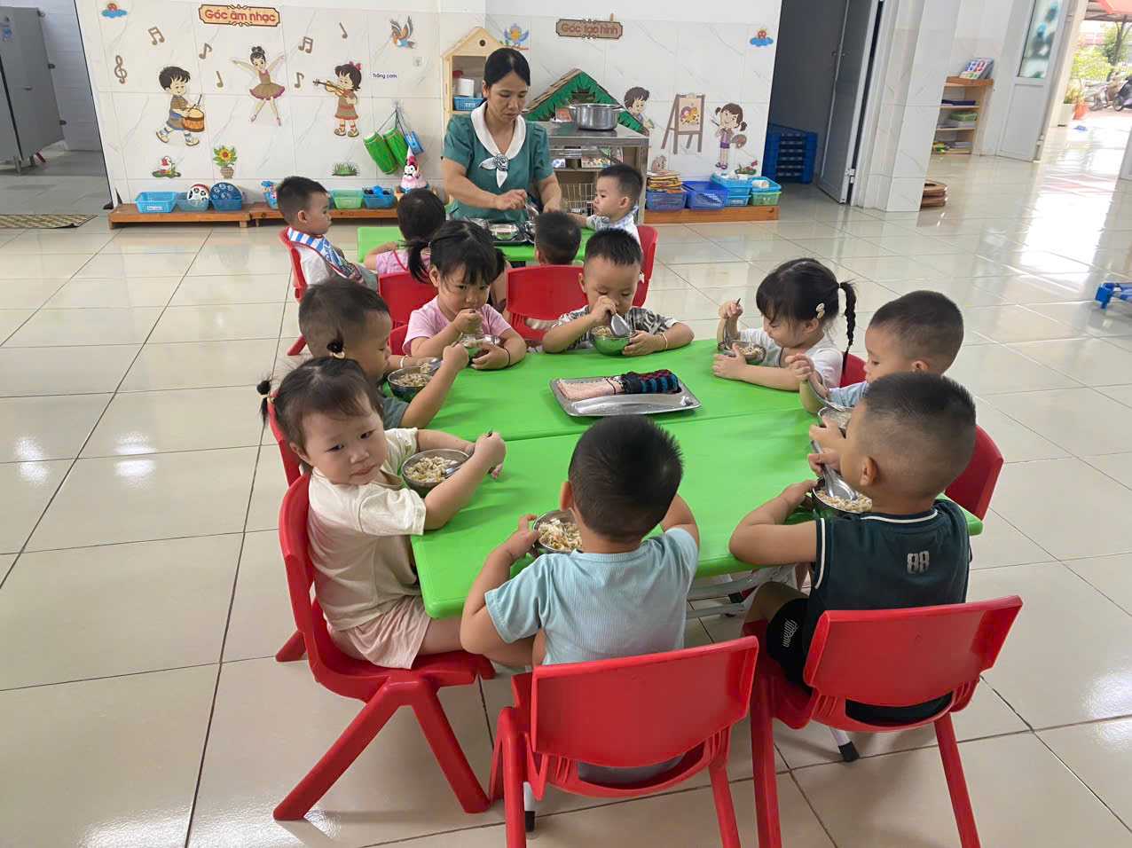 Thứ 2 ngày 26 tháng 08 năm 2025. Lớp NTD4 tổ chức hoạt động tổ chức giờ ăn. Khi tổ chức giờ ăn cho các con. Cô phải vệ sinh cá nhân cho các con sạch sẽ trước khi ăn. Cho trẻ ngồi về bàn của mình cô rèn cho các con kỹ năng cầm thìa tay phải, khi cơm rơi cơm vãi các con phải nhặt vào khay, rồi lau tay vào khăn. Khi ăn cô rèn cho trẻ mời cô và các bạn ăn cơm. Trong khi ăn cô động viên trẻ ăn hết xuất của mình.